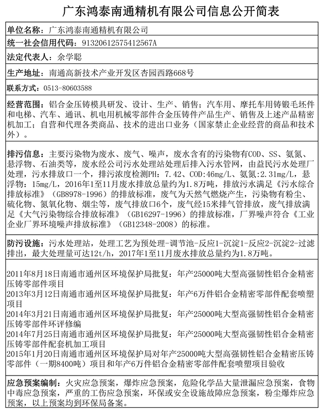 廣東鴻泰南通精機有限公司環保信息公開簡表