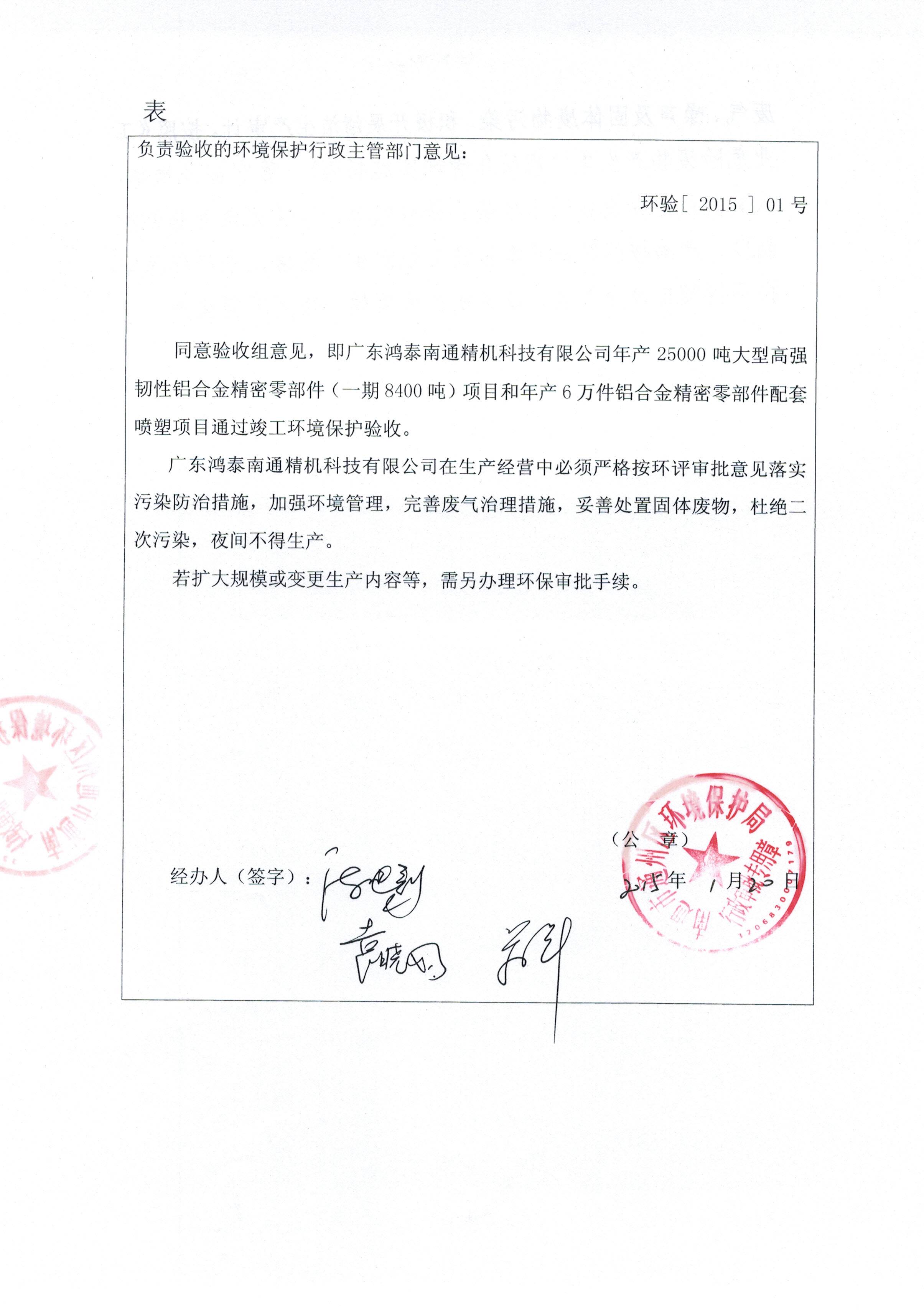 2015年1月20日通州區環保局同意驗收組意見,廣東鴻泰一期項目(年產8400噸大型高強韌性鋁合金精密零部件和年產6萬件鋁合金精密零部件配套噴塑項目)通過竣工環境保護驗收,我公司將按照規定合法合規操作,加強環境保護。